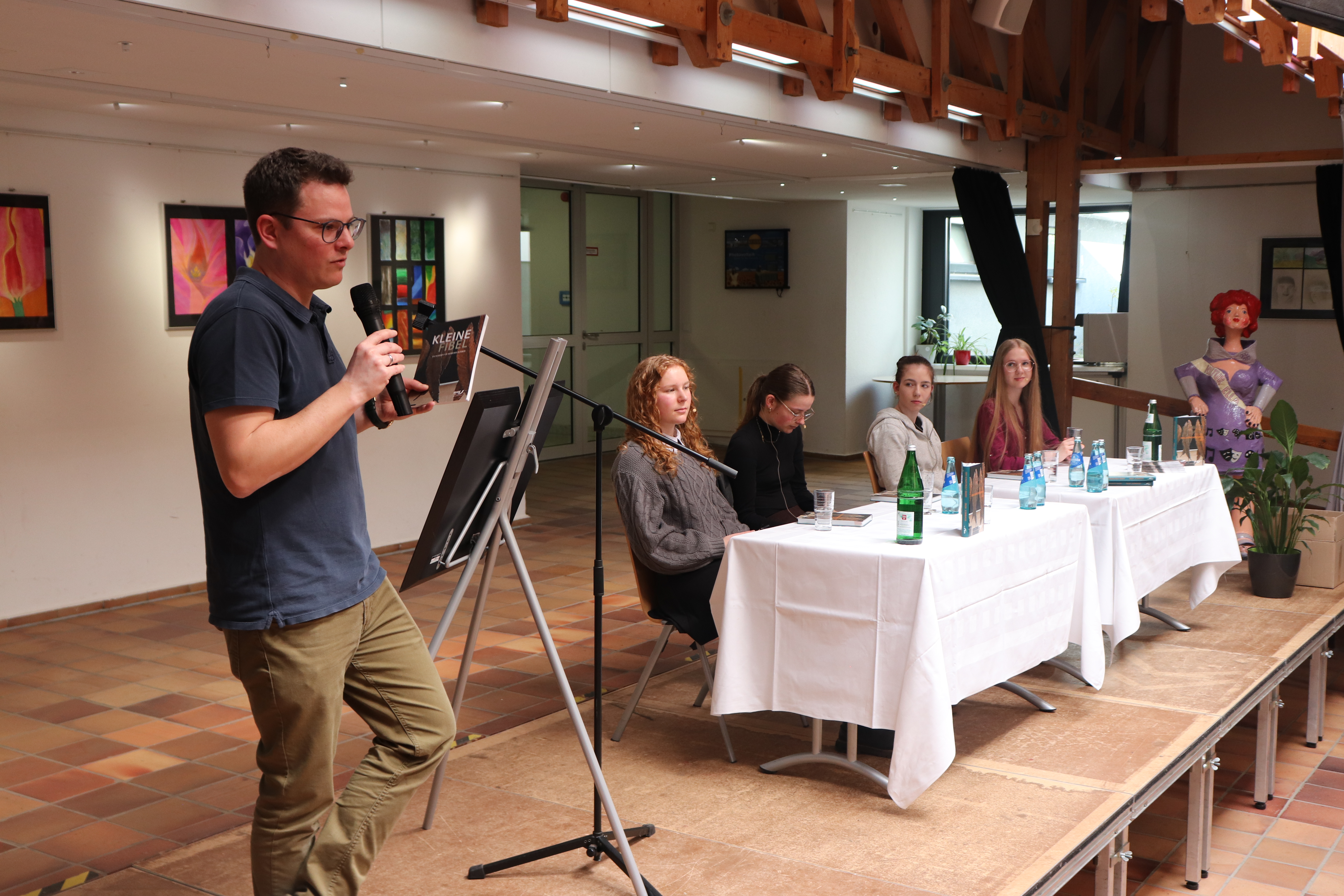 Am vergangenen Freitag war es dann im Atrium des Laubach – Kollegs wieder so weit. Studienleiter Dr. Hanns Thiemann freute sich in seiner Begrüßung für die Schülerinnen und Schüler der Einführungsphase und der Q2, dem literarischen Hochgenuss der vier Preisträgerinnen lauschen zu können und betonte die Wichtigkeit des Lesens in Zeiten zunehmender Digitalisierung. Sabine Schüller, Koordinatorin für Kulturelle Förderung am Laubach-Kolleg, begrüßte die Preisträgerinnen sowie Moderator der Veranstaltung Jan Michel Kaufmann, zuständig für Öffentlichkeitsarbeit der OVAG und natürlich die Schülerinnen und Schüler sowie die anwesenden Kolleginnen und Kollegen des Laubach-Kollegs. Sie freute sich besonders darüber, dass in diesem Jahr neben den drei Preisträgerinnen der OVAG mit Michelle Sofia Deerberg eine Schülerin des Laubach Kollegs vertreten war, die als Preisträgerin aus dem Wettbewerb „geh weiter, leben“ der Lübecker Jugendbuchtage hervorgegangen war. Vor dem Hintergrund ihrer Vorfreude auf die anspruchsvollen literarischen „Kostproben“ der aktuellen Preisträger ermutigte sie die Schülerinnen und Schüler, in diesem Jahr auch mit selbst verfassten Texten am OVAG-Jugendliteratur-Wettbewerb teilzunehmen. Schüller verwies darauf, dass es in einem ersten Schritt vor allem wichtig sei, sich von den Zweifeln an den eigenen Fähigkeiten und der Angst vor der eigenen Courage freizumachen, um dann den Weg mit Selbstvertrauen, Mut und gesunder Kritikfähigkeit zu beschreiten. Sie beendete ihre Überlegung mit einem Zitat aus Härtlings Essay „Lest Leute! Lest weiter!“, einem leidenschaftlichen Appell an junge Menschen zu lesen, und ergänzte den Titel mit „Schreibt, junge Schriftsteller! Schreibt weiter!“