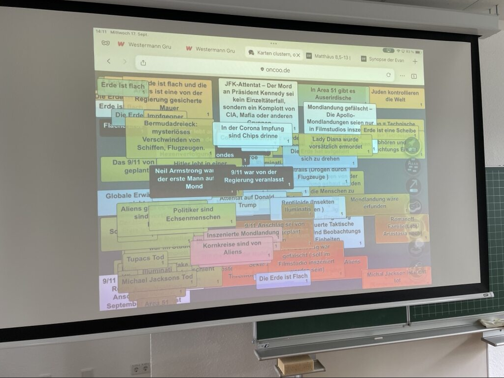 Im Bereich „Gesellschaftliche Verantwortung“ beschäftigten sich unter Leitung von Henning Müller und Christoph Koch mit Merkmalen und Gefahren von Verschwörungstheorien. Nachdem die Schülerinnen und Schüler sich anhand selbst gewählter Beispiele mit kreativen Präsentationen diese erschlossen hatten, wurden in einem Rollenspiel Strategien zum Umgang mit Verschwörungstheorien im privaten Umfeld erprobt und reflektiert. Dabei wurde deutlich, dass es gar nicht so einfach ist, das geschlossene Weltbild des Verschwörungstheoretikers zu widerlegen, sondern es eher um die Entwicklung bzw. Wiederherstellung von Vertrauen durch Empathie und Hilfsangebote gehen sollte.