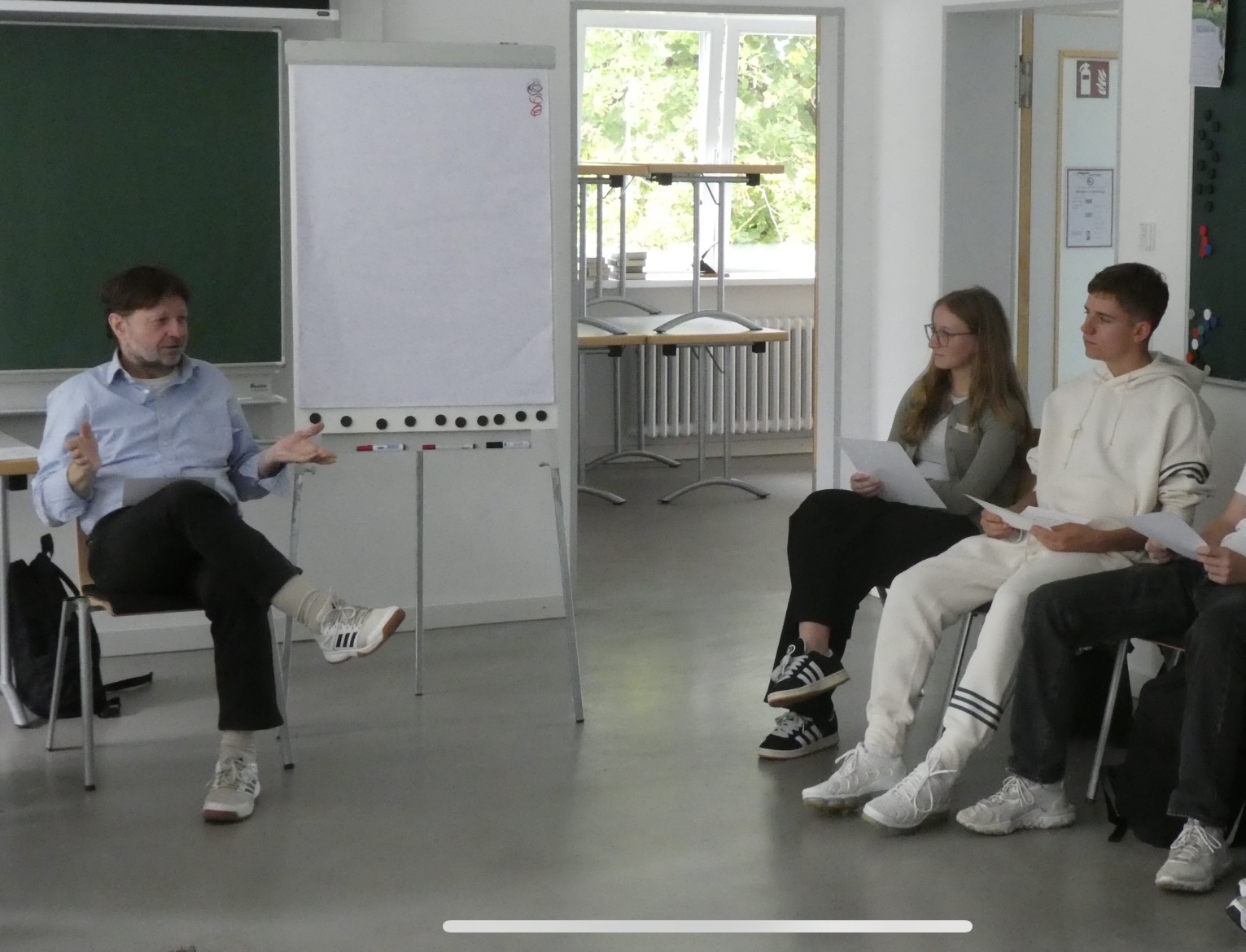 Das Profilfeld „Sprachen und Arbeitswelt“ führte unter organisatorischer Leitung von Dr. Peter Maier und Ulrike Castro – Leduc anwendungsorientiert in die Grundlagen der Rhetorik ein. Frank Winterstein - studierter Sprecherzieher, Hörbuchsprecher und Schauspieler aus Marburg stellte dabei Stimme und Körpersprache als entscheidenden Werkzeuge eines Redners und als Voraussetzung für gelingende Kommunikation vor. Mit einem skurrilen Text, der Ansprache eines Käfers an seine lieben Mitkäfer (Auszug: "Liebe Mitkäfer! Ein Käfer über Käfer - sollte man nicht einen Käfer bitten, einen Nichtkäfer zu bitten, über Käfer zu sprechen? Was weiß schon ein Käfer über Käfer?"), lud der Referent die Schülerinnen und Schüler ein, die Variationsmöglichkeiten von Stimmführung, Lautstärke, Betonung und Atempausen zu entdecken und den Inhalt mit angemessener Gestik zu unterstreichen. Sowohl zur kurzen Deklamation einer Passage reihum im Stuhlkreis als auch zum finalen Auftritt vor dem Plenum nach einer Phase der Vorbereitung in Kleingruppen gab es von ihm konstruktives Feedback.