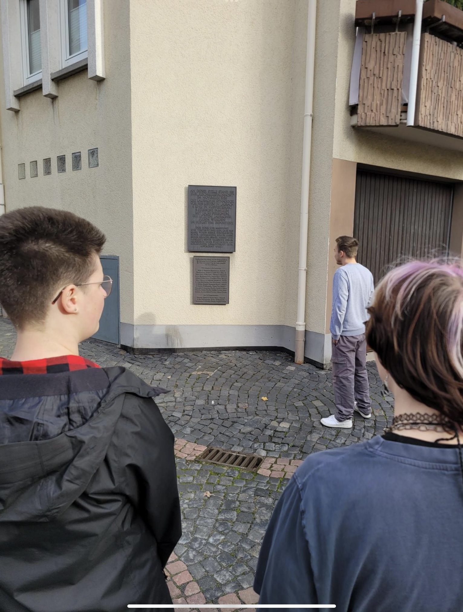 Beim Rundgang durch Laubach wurden Zeitzeugenberichte über die menschenverachtenden Übergriffe der Nationalsozialisten auf die jüdischen Mitbürger und die Synagoge verlesen. An den Häusern, vor denen die Stolpersteine verlegt sind, wurde der Menschen gedacht, indem ihre Namen und die biografischen Angaben verlesen wurden. Auch wurden die Stolpersteine wieder gereinigt, damit sie besser erkennbar und lesbar sind. Da viele der Stolpersteine am Marktplatz verlegt sind, also in einer privilegierten Lage, wurde erläutert, dass jüdischen Menschen seit dem Mittelalter handwerkliche Berufe verboten waren und ihnen der Handel als Alternative blieb. Hierbei sind einige durchaus zu Wohlstand gekommen, weshalb rund um den Marktplatz 5 ehemals von Juden bewohnte Häuser stehen. Der Rundgang führte auch zum Standort der ehemaligen Synagoge , wo an die Angriffe und Zerstörungswut vom 9./10 November 1938 eindrücklich mit Zeitzeugenberichten erinnert wurde. Die Gedenktafel am Standort der ehemaligen Synagoge erinnert an den Art 3 des Grundgesetzes, wonach niemand“ wegen seines Geschlechts, seiner Abstammung, seiner Rasse, seiner Sprache, seiner Heimat und Herkunft, seines Glaubens, seiner religiösen oder politischen Anschauungen benachteiligt oder bevorzugt werden darf.“ Viele der Schülerinnen und Schüler waren von den Eindrücken des Nachmittags ergriffen, betonten aber zugleich, wie interessant und wichtig der Nachmittag für sie gewesen sei. |