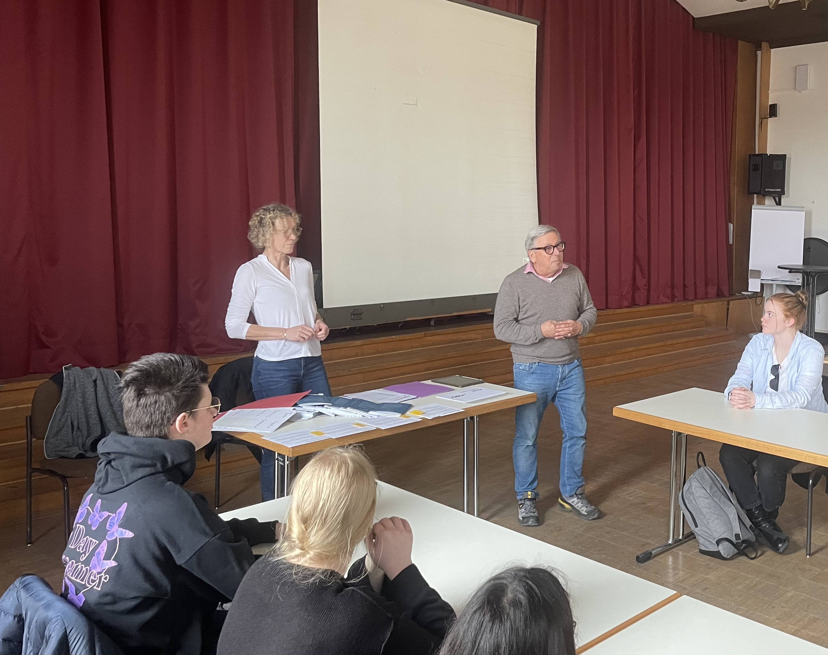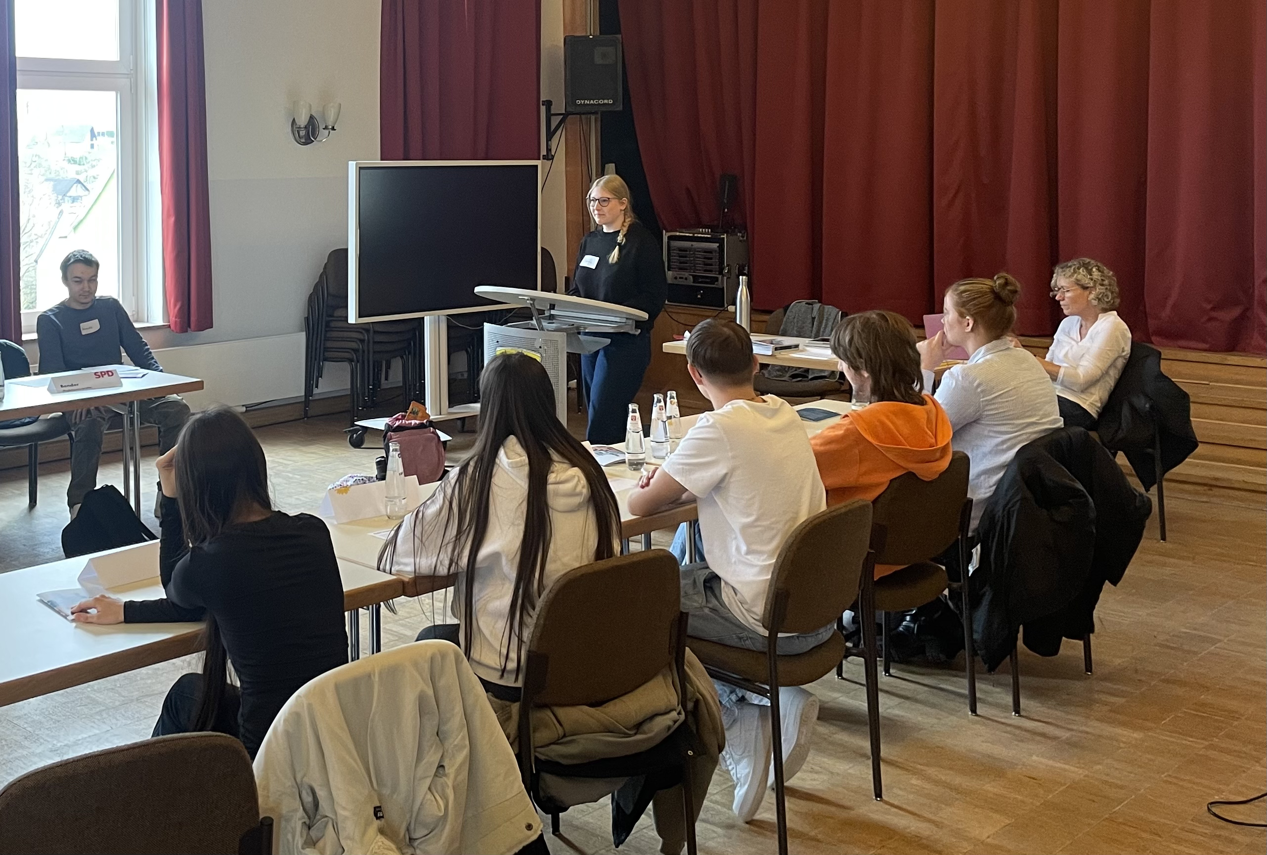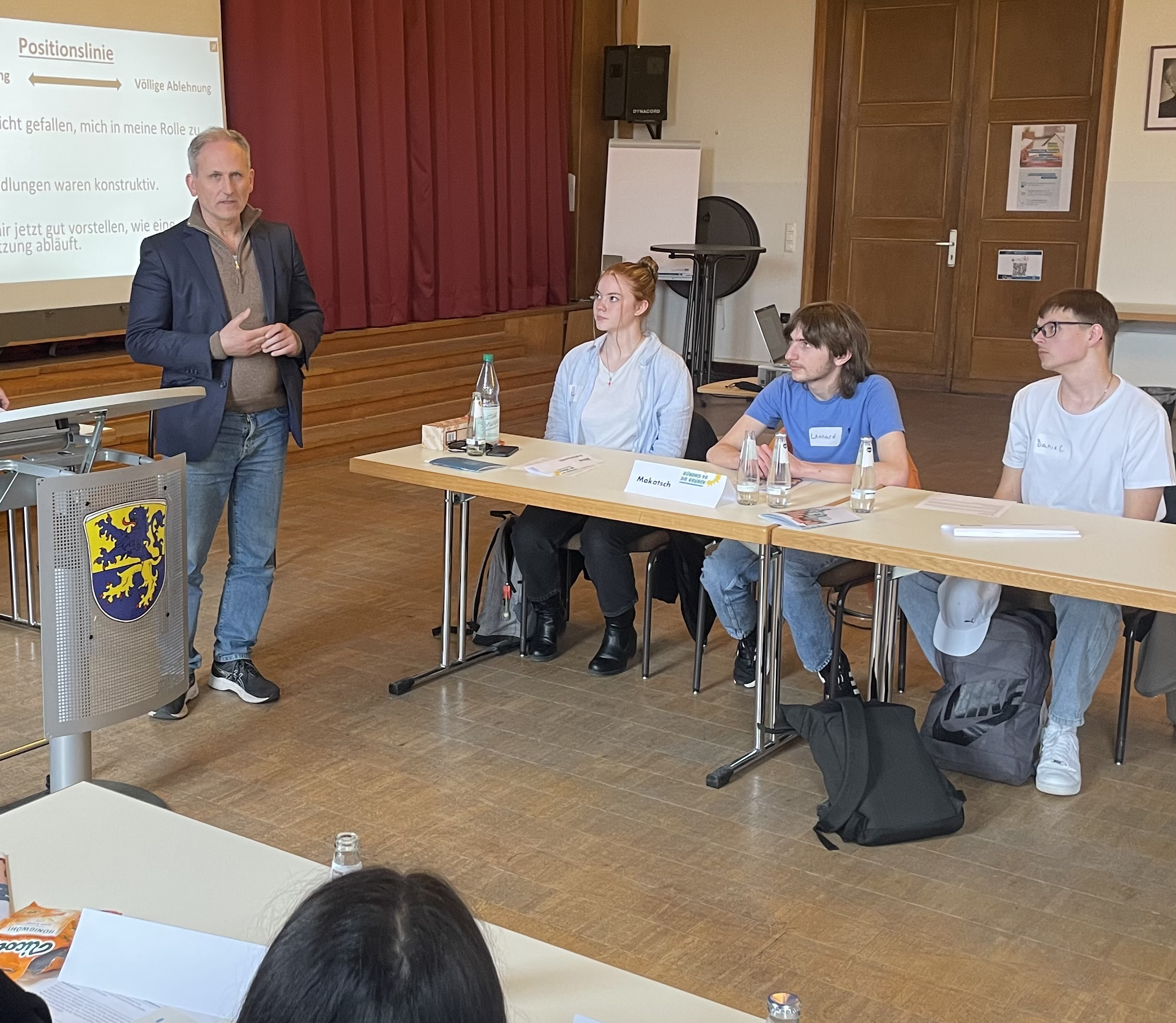 Im Bereich „Gesellschaftliche Verantwortung“ begaben sich die Schülerinnen und Schüler unter Leitung von Henning Müller und Lisa Philipps ins Rathaus der Stadt Laubach, um als Abgeordnete des Kreistages über ein 365€ Ticket für den ÖPNV zu entscheiden. Nachdem die Schülerinnen und Schüler sich in ihre Rollen eingefunden hatten, suchten sie in ihren Fraktionen eine gemeinsame Position zu dem Ticket und trafen dann im Plenum des Kreistages auf die unterschiedlichen Interessen und Haltungen der anderen Fraktionen, sodass eine Mehrheit im kontroversen Austausch und in weiteren Fraktionssitzungen gefunden werden musste. Auf diese Weise erlebten die Schülerinnen und Schüler im Vorfeld der Kommunalwahl in Hessen die Strukturen und Entscheidungsprozesse auf kommunaler Ebene. Stadtverordnetenvorsteher der Stadt Laubach Joachim Kühn sowie Bürgermeister Matthias Mayer statteten dem Planspiel einen Besuch ab und zeigten sich beeindruckt von dem Einsatz und dem Interesse der Schülerinnen und Schüler.