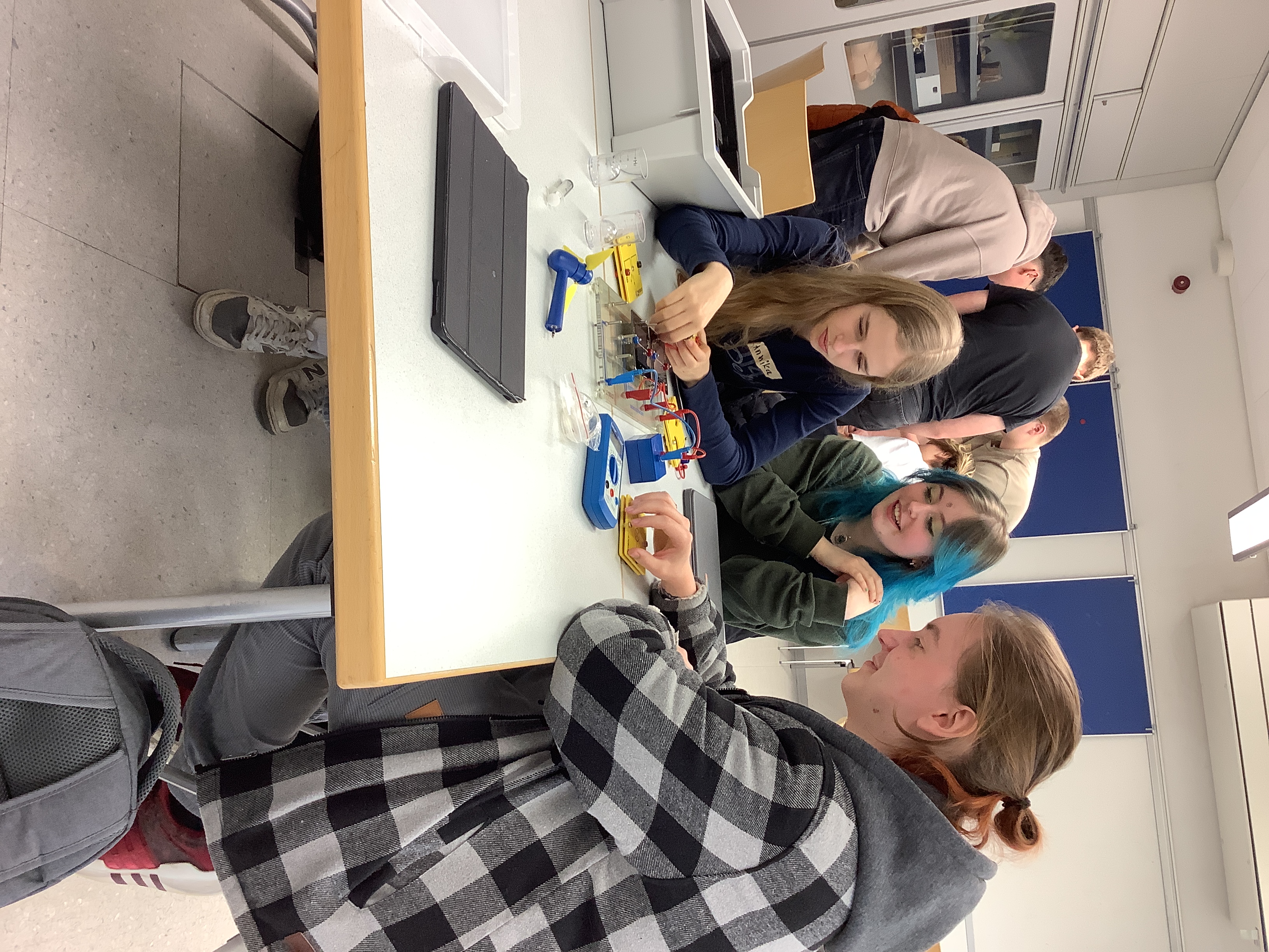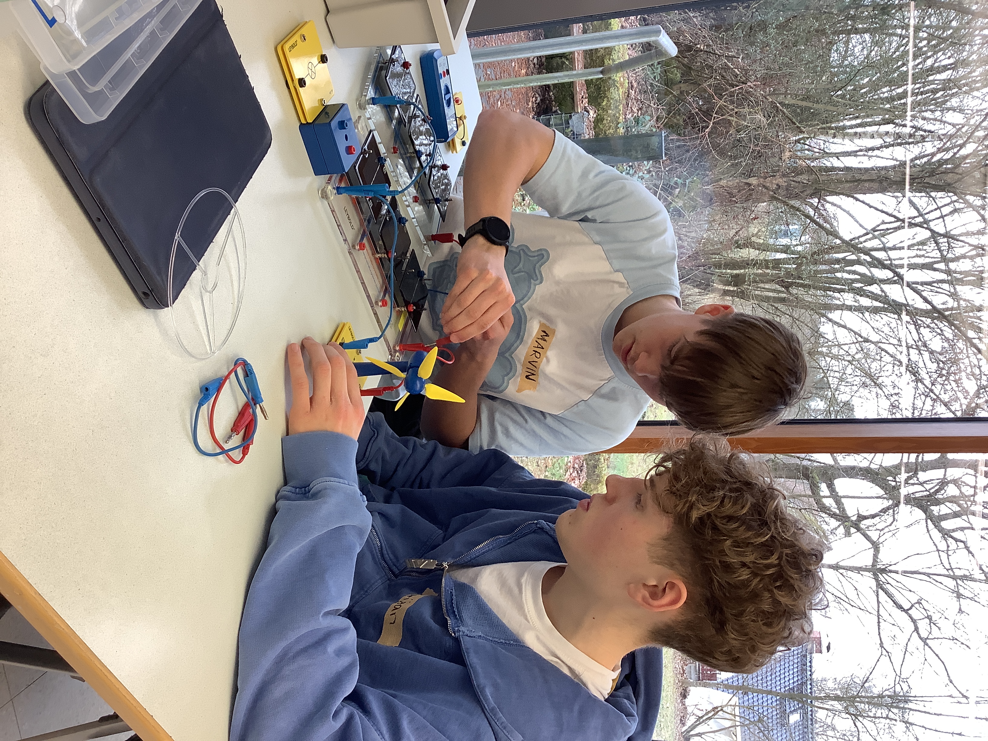 Im Profil Ökologie lernten die Schülerinnen und Schüler außergewöhnliche und spannende Möglichkeiten der Energiegewinnung kennen; darunter die Gewinnung von Biomasse an Hauswänden, Windbäume in Parkanlagen, kombinierte Solar- und Windparks, die Wüsten ergrünen lassen sollen, Gehplatten, die Strom erzeugen sowie Stromerzeugung aus dem All. Mithilfe von Solar-Wind-Experimentierkästen experimentierten die Schülerinnen und Schüler an der Verschaltung von Energiegewinnungsformen. Bei den vielfältigen Möglichkeiten der Energiegewinnung stellte sich natürlich auch die Frage nach dem Transport und der Speicherfähigkeit der Energie, wo Wasserstoff eine zentrale Rolle zukommen wird. In einem Experiment wurde die Gewinnung von Wasserstoff (chemische Energie) aus elektrischer Energie gezeigt. Für den Nachweis von Wasserstoff über die Knallgasprobe wurde der Wasserstoff in Seifenblasen gefüllt und dann verbrannt. So lernten die Schülerinnen an diesem Nachmittag auch die Notwendigkeiten und Möglichkeiten der Energieumwandlung in die verschiedenen Energieformen kennen. Der Studiennachmittag verband so die Schulfächer Physik, Chemie und Politik und Wirtschaft miteinander. Die begleitenden Lehrkräfte waren Esther Ohl und Olaf Kühnapfel.