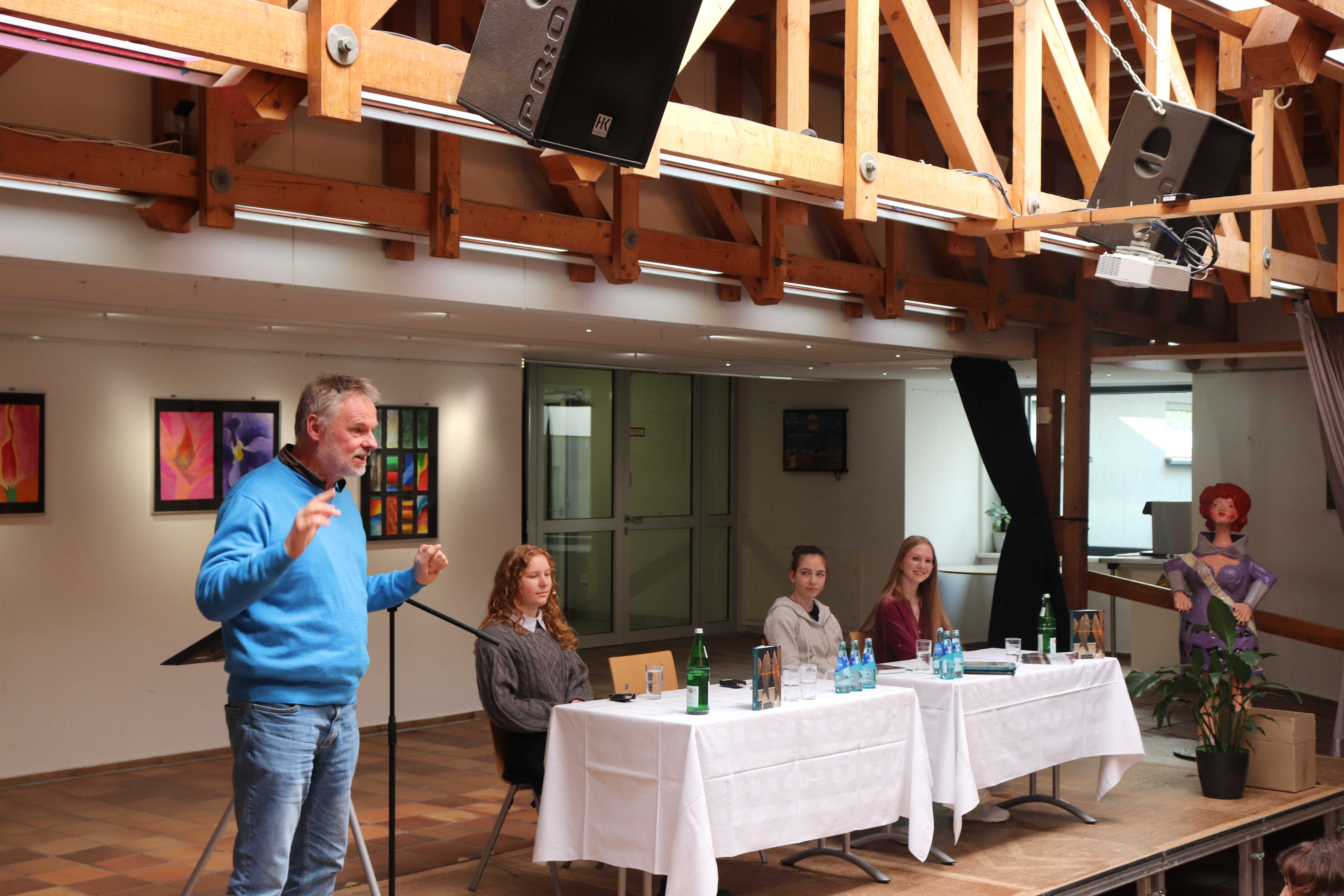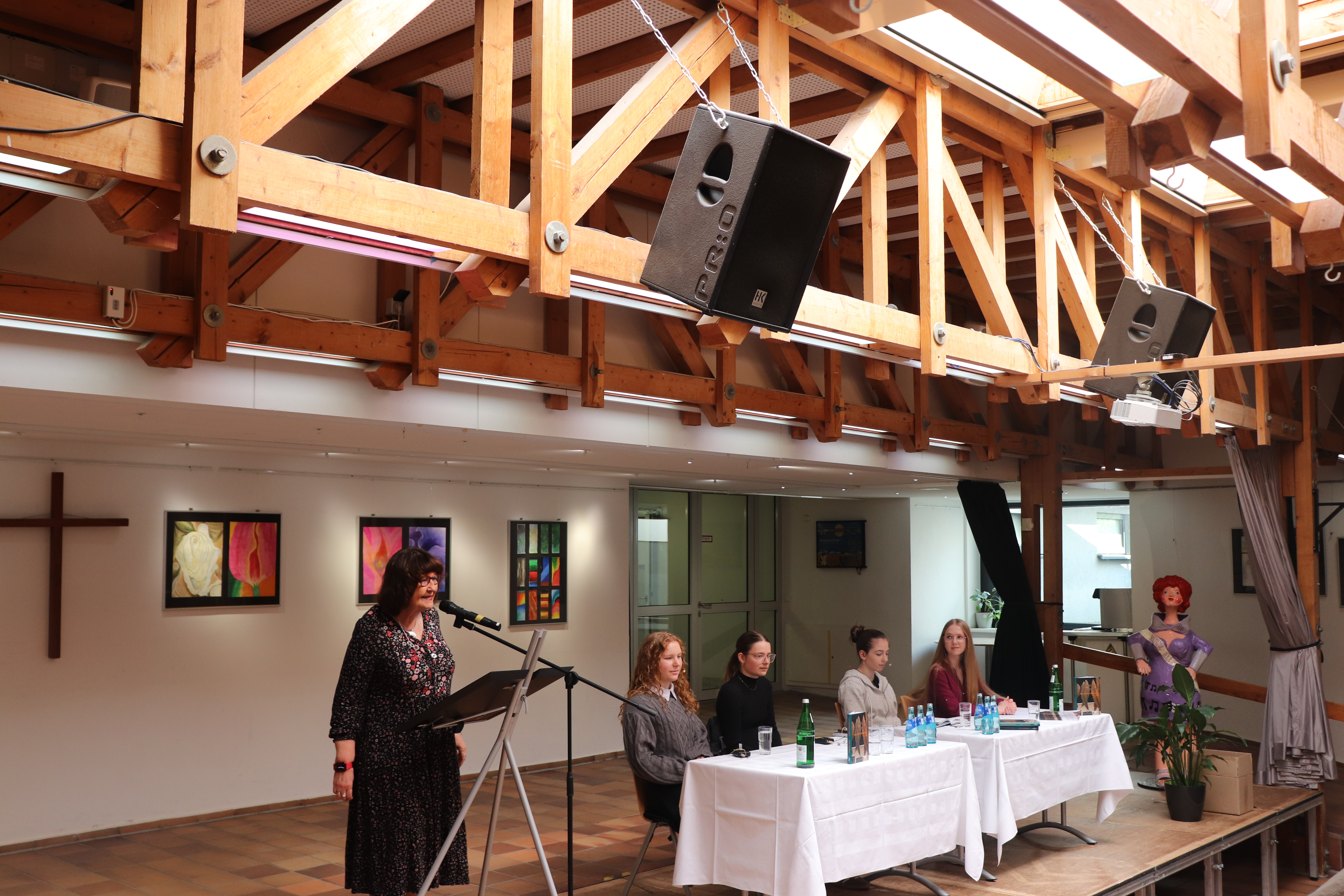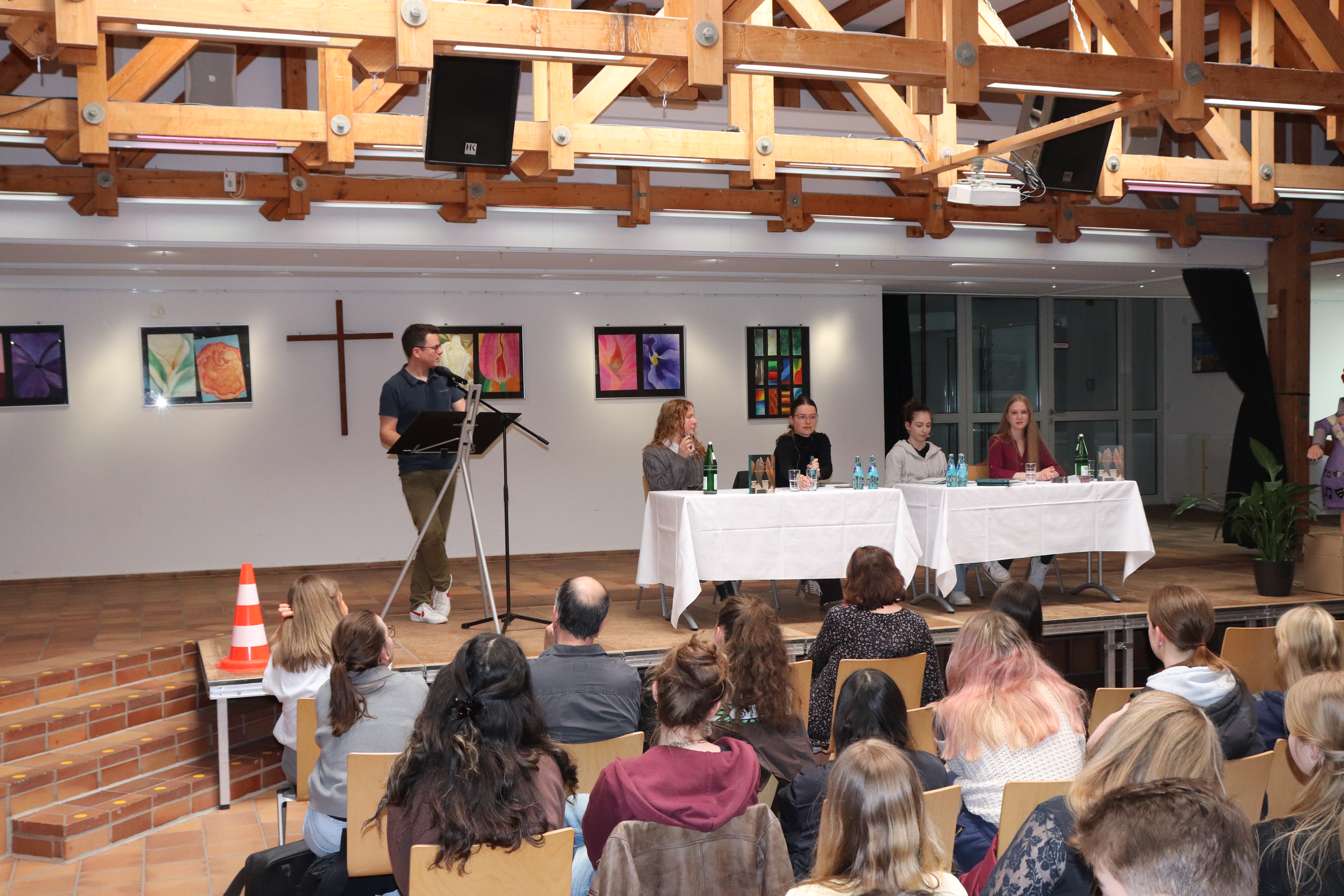 Am vergangenen Freitag war es dann im Atrium des Laubach – Kollegs wieder so weit. Studienleiter Dr. Hanns Thiemann freute sich in seiner Begrüßung für die Schülerinnen und Schüler der Einführungsphase und der Q2, dem literarischen Hochgenuss der vier Preisträgerinnen lauschen zu können und betonte die Wichtigkeit des Lesens in Zeiten zunehmender Digitalisierung. Sabine Schüller, Koordinatorin für Kulturelle Förderung am Laubach-Kolleg, begrüßte die Preisträgerinnen sowie Moderator der Veranstaltung Jan Michel Kaufmann, zuständig für Öffentlichkeitsarbeit der OVAG und natürlich die Schülerinnen und Schüler sowie die anwesenden Kolleginnen und Kollegen des Laubach-Kollegs. Sie freute sich besonders darüber, dass in diesem Jahr neben den drei Preisträgerinnen der OVAG mit Michelle Sofia Deerberg eine Schülerin des Laubach Kollegs vertreten war, die als Preisträgerin aus dem Wettbewerb „geh weiter, leben“ der Lübecker Jugendbuchtage hervorgegangen war. Vor dem Hintergrund ihrer Vorfreude auf die anspruchsvollen literarischen „Kostproben“ der aktuellen Preisträger ermutigte sie die Schülerinnen und Schüler, in diesem Jahr auch mit selbst verfassten Texten am OVAG-Jugendliteratur-Wettbewerb teilzunehmen. Schüller verwies darauf, dass es in einem ersten Schritt vor allem wichtig sei, sich von den Zweifeln an den eigenen Fähigkeiten und der Angst vor der eigenen Courage freizumachen, um dann den Weg mit Selbstvertrauen, Mut und gesunder Kritikfähigkeit zu beschreiten. Sie beendete ihre Überlegung mit einem Zitat aus Härtlings Essay „Lest Leute! Lest weiter!“, einem leidenschaftlichen Appell an junge Menschen zu lesen, und ergänzte den Titel mit „Schreibt, junge Schriftsteller! Schreibt weiter!“